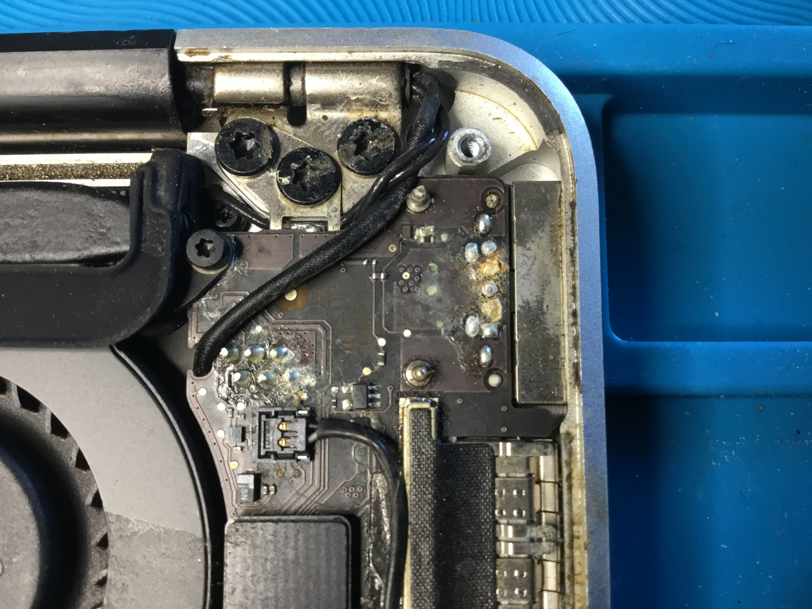 These images are from a MacBook Air that was allowed to ‘dry out’ overnight. Unfortunately the laptop was powered on at this point and if damage had not already occurred then it probably did when powered on. There was still liquid present inside the machine and corrosion that would need cleaning and some of the components were blown.